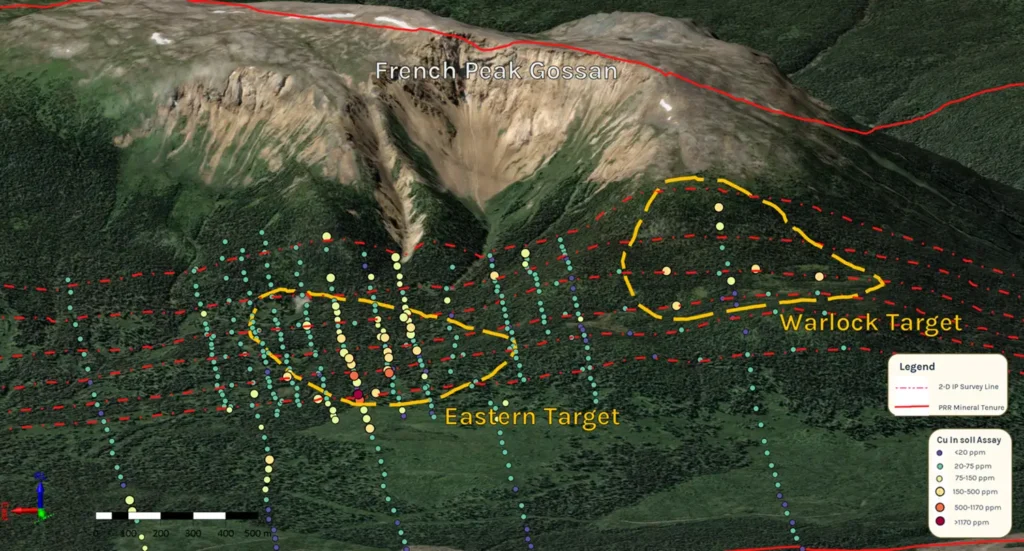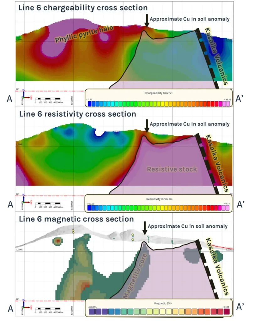 The IP survey successfully identified a geophysical target that measures ~ 1 km x 2 km defined by coincident chargeability, resistivity, and magnetic responses. This geophysical target overlaps with the copper in soil anomalies collected in previous exploration campaigns and during the summer 2025 program. Together, these results suggest a strong potential for porphyry-style mineralization.