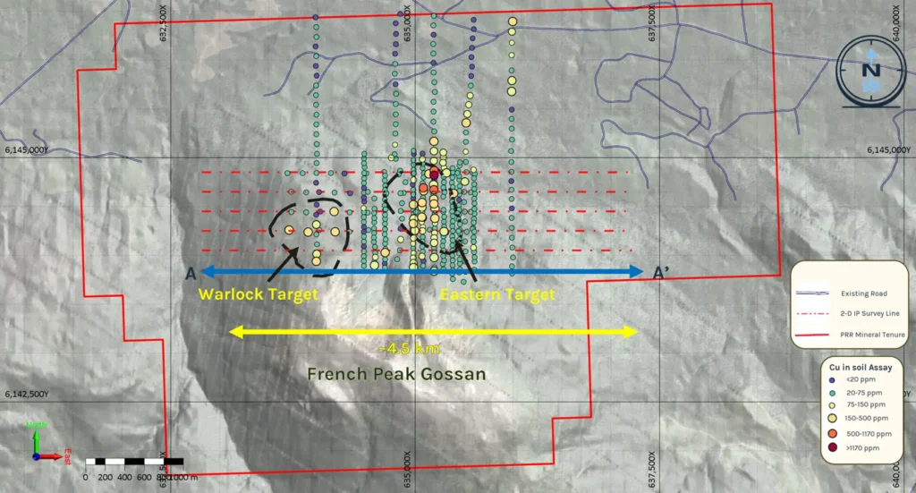 Figure 3 – Plan map showing the location of the six 2025 IP survey lines together with copper soil geochemistry results (see legend). Note the east-west line labeled A – A’ which serves as a reference line for cross-sections shown in Figure 4.