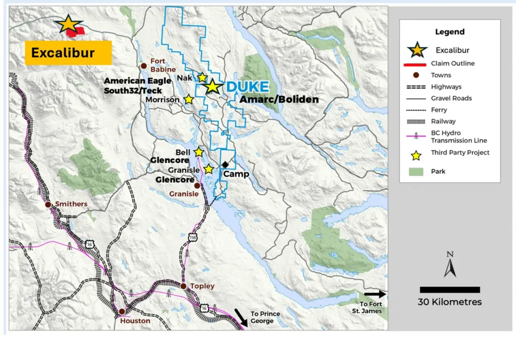 Figure 1 – Excalibur Property location in relation to the past producing Bell and Granisle porphyry mines and Amarc/Boliden’s Duke deposit